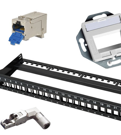 Izbor utičnica, patch panela, podnih kutija, konektora i drugih komponenti kablova.